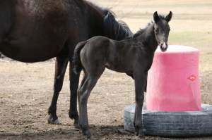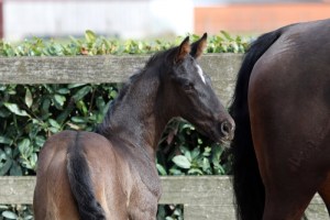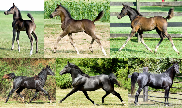 Santa Ray, fekete színű arab telivér csikó 5 naposan, 1- és 2 hónaposan, valamint 1- és 3 éves korában. A képeken jól látszódik, hogy még az olyan egyszerű színek is, mint a fekete, milyen árnyalatváltozásokon eshetnek át. (asarabians.com)