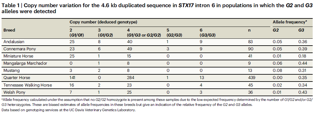 A szürke és nem szürke lovak genotípusának leírása tehát megváltozott. Mivel a STX17 gén eredeti formájában az említett 4,6kB hosszúságú génszakasz csak egyszer található meg, így a színes lovak genotípusát G1-nek jelölték meg a korábbi g helyett. (Egyes tesztekben találkozhatunk a megszokott N, mint normal vagy non-gray jelöléssel.) Ha ez a génszakasz egy génen belül kétszer (G2) vagy háromszor (G3) található meg duplikáció vagy triplikáció miatt, a ló szürke lesz.