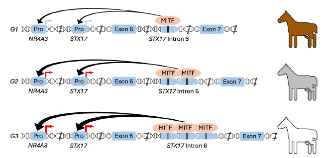 A G1, G2 és G3 allél ábrázolása: az allélok elnevezése azon alapszik, hogy a releváns génszakasz hány példányban (kópiában) található meg a STX17 génben. Az ábra azt is jelöli, hogy ez a kópiaszám-variáció milyen további hatással van más gének működésére, mely a szürkülést és a megnövekedett melanóma-kockázatot okozza. Forrás: Rubin C-J. et al.: An intronic copy number variation in Syntaxin 17 determines speed of greying and melanoma incidence in Grey horses, Fig.1. doi: 10.1101/2023.11.05.565619