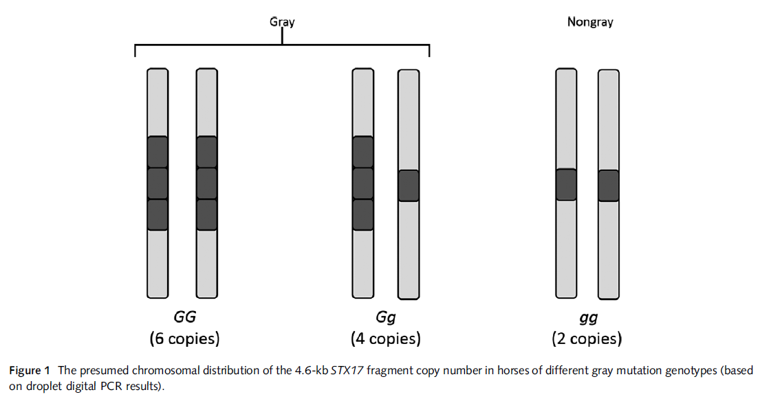 Nowacka-Woszuk, J., Mackowski, M., Stefaniuk-Szmukier, M., & Cieslak, J. (2021). The equine graying with age mutation of the STX17 gene: A copy number study using droplet digital PCR reveals a new pattern. Animal genetics, 52(2), 223–227. https://doi.org/10.1111/age.13044