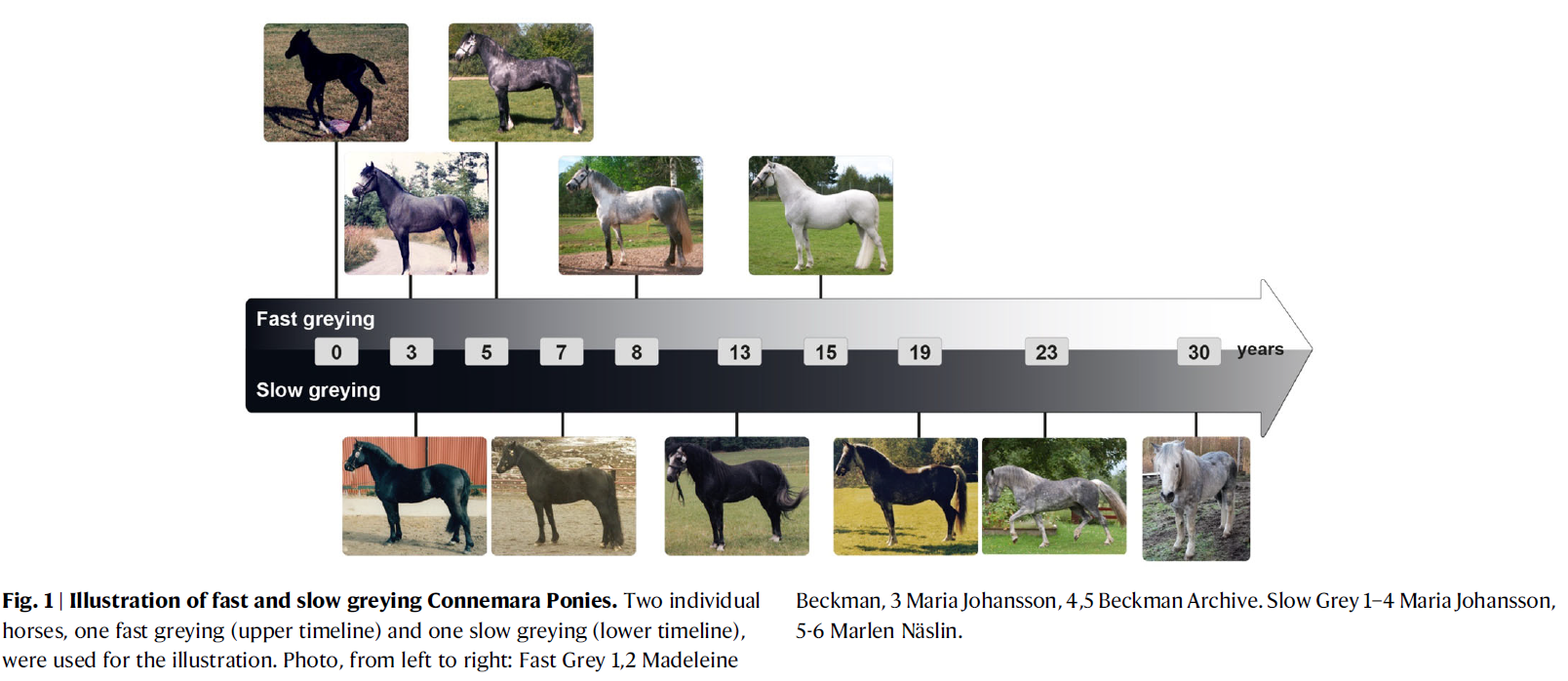 A gyorsan- és lassan szürkülő fenotípusok közötti különbség két Connemara pónival ábrázolva. Forrás: Rubin C-J. et al.: An intronic copy number variation in Syntaxin 17 determines speed of greying and melanoma incidence in Grey horses, Fig.1. doi: 10.1101/2023.11.05.565619